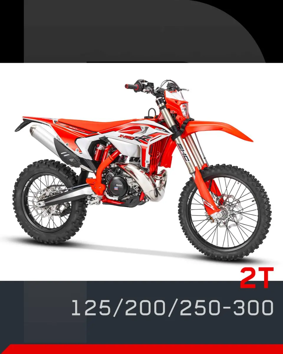 – RR X-PRO 2T 200 MY 2025: La parte ciclo y el motor derivan de su hermana menor; garantizando un peso muy reducido y una gran agilidad, pero con unos valores de par y potencia netamente superiores. Gracias al engrase separado y al arranque eléctrico es una moto muy completa dedicada a los aficionados al Enduro.