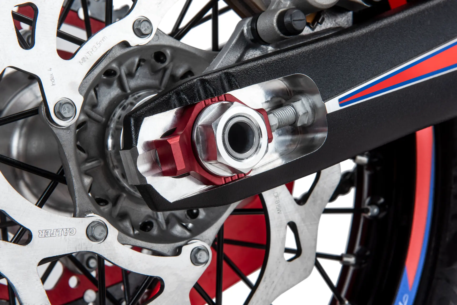 – Perno de la rueda aumentado. El perno de la rueda trasera se ha reforzado, ganando 2 mm de diámetro, pasando por tanto a 22 mm. Este nuevo componente garantiza una mayor rigidez y resistencia a la torsión, con el resultado de tener una motocicleta siempre precisa y bien direccionable, incluso en las aceleraciones más violentas. Como resultado de este trabajo, también se actualizaron la pinza del freno trasero del basculante y los espaciadores de las ruedas para que encajaran perfectamente.