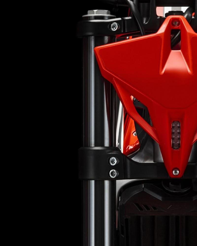 Otra gran novedad: la SINCRO puede equiparse (excepto en la 125cc) con arranque eléctrico. Se ofrece como kit de accesorios Factory Parts y puede instalarse posteriormente sin modificar los cárteres. La batería se aloja tras la máscara del faro.
