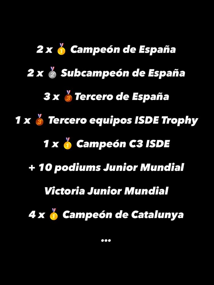 Asimismo, atesora una victoria y 10 cajones en el Mundial 2022 de Júnior2 entre 2020 y 2022 y hasta cuatro títulos regionales de la especialidad (2017/Júnior Open, 2019/Enduro Élite y 2021/Enduro Elite y Scratch) en Cataluña.