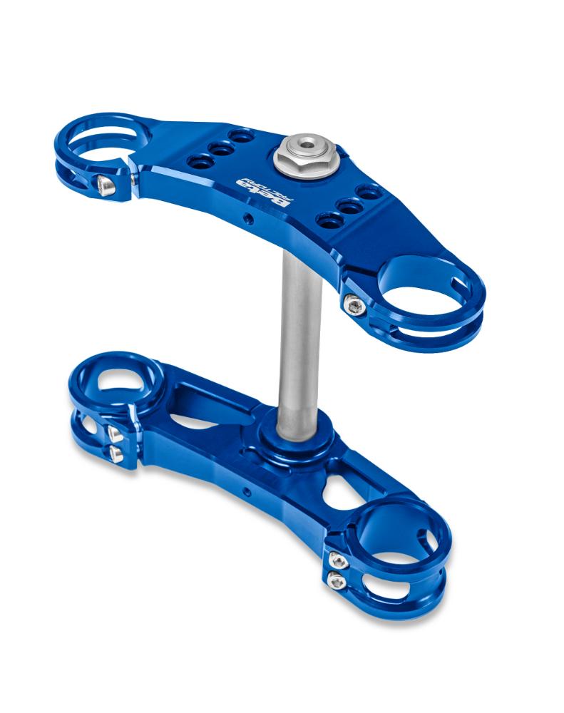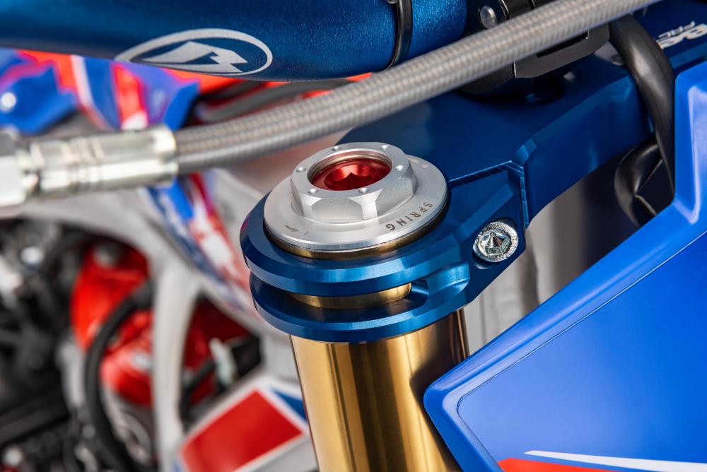 – Placas de dirección mecanizadas en bloque y anodizadas en azul. Garantizan rigidez y ligereza (con un peso aproximado de 100 g menos que las estándar), lo que también permite avanzar/retroceder los soportes del manillar (con doble tornillo) para encontrar la posición de conducción ideal. El diseño de este componente es nuevo y está notablemente embellecido con acabados, al igual que en las motos de los pilotos del Beta Factory Trial Team 2026.