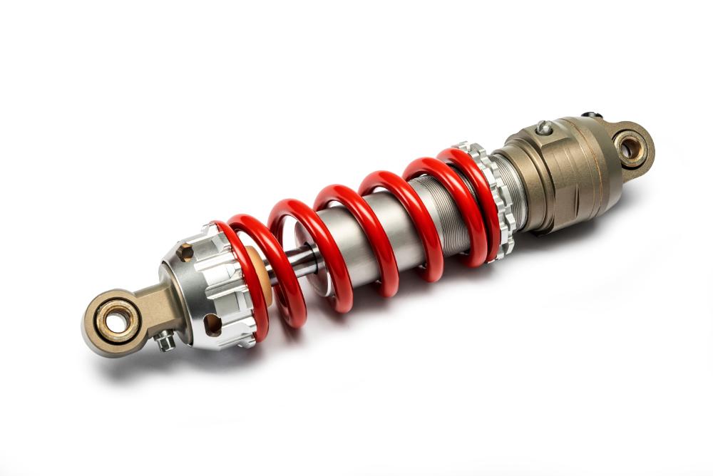 – Monoshock. Este componente, exclusivo de los modelos FACTORY, tiene un nuevo esquema de montaje que, junto con un ajuste dedicado al nuevo enlace, lo hace más progresivo en su respuesta, contribuyendo a la centralización de las masas (sin perjuicio de su distancia entre ejes). El cuerpo es de aluminio muy ligero, a pesar de ser de mayor tamaño que los modelos estándar. Entre los ajustes se ha añadido uno nuevo para la compresión, mientras que se mantienen los de extensión y precarga del muelle.